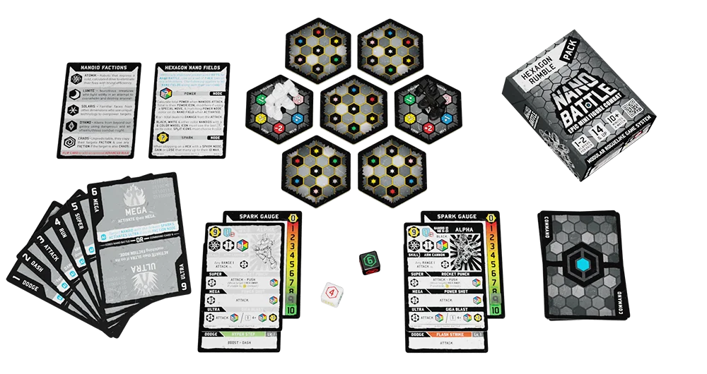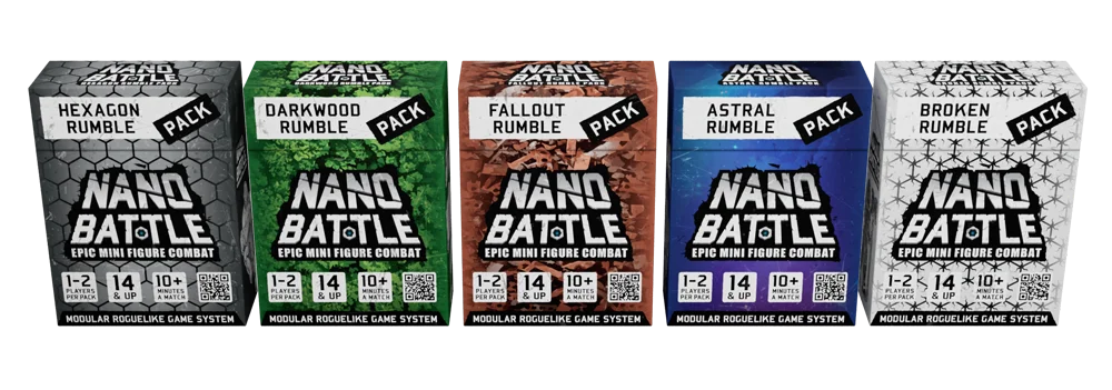 Every Rumble Pack has a unique Advanced Rule on the back of the Nanoid Factions card & two Experience Mode cards used to level up Nanoids in any Match.